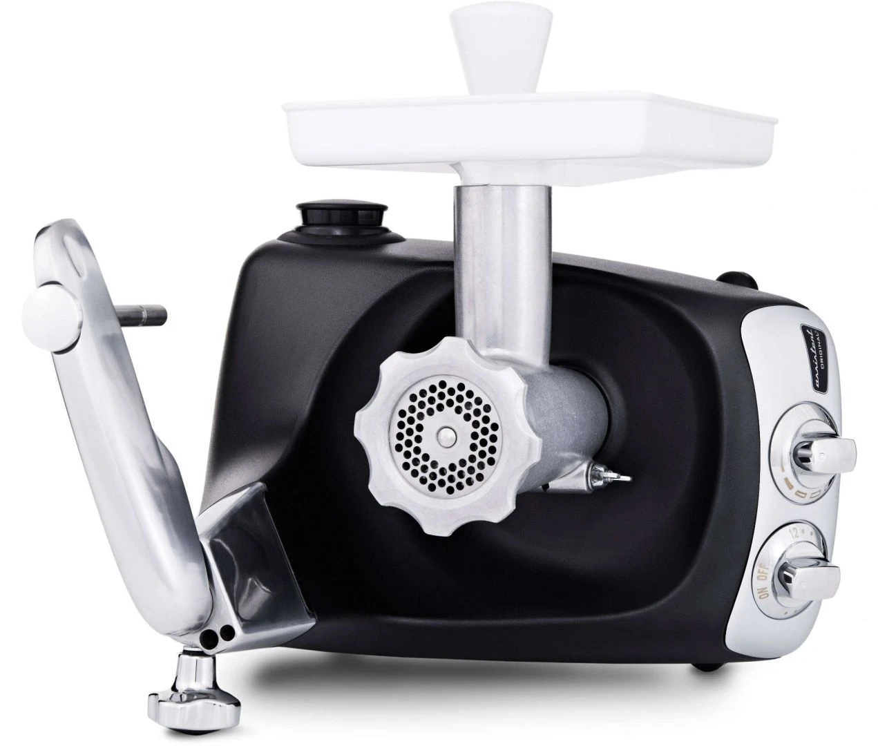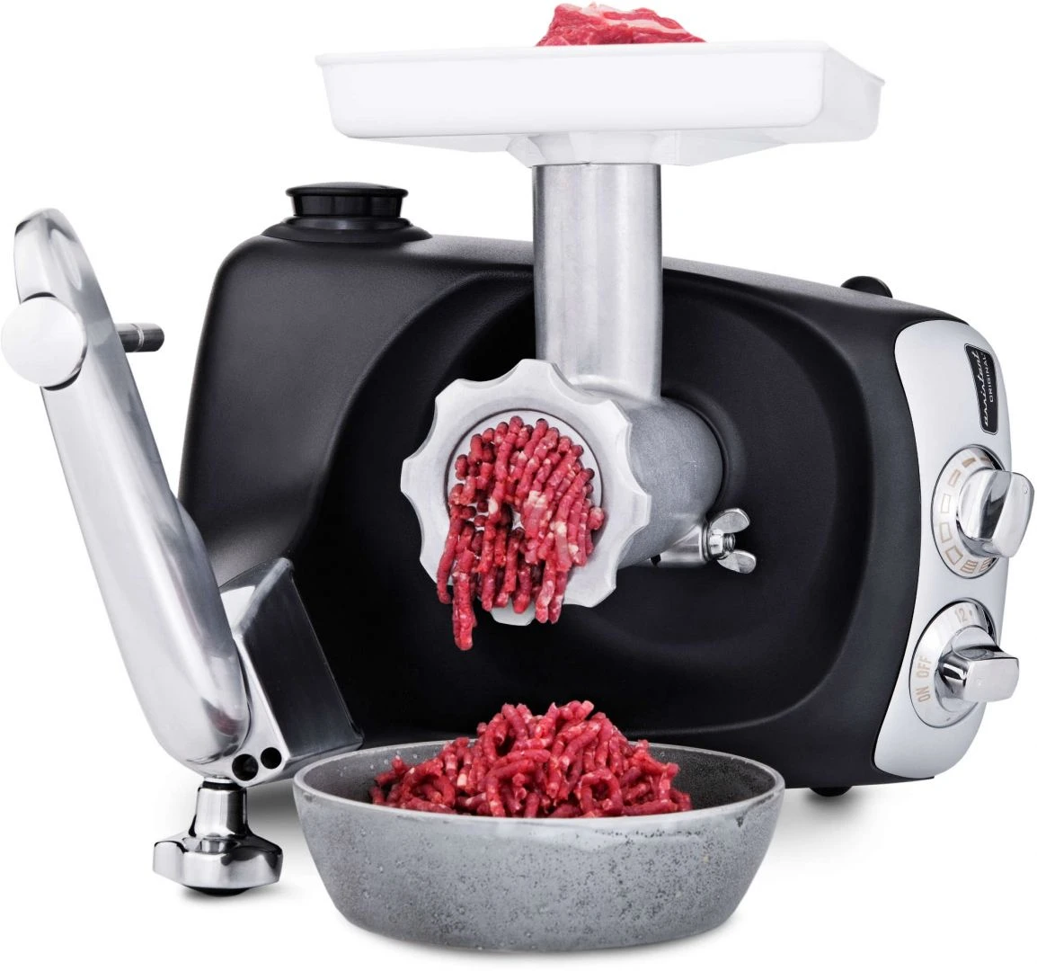 | Accessoire(s) inclus | Corps de hachoir, 3 embouts à saucisses 10/20/25 mm, Plateau d’alimentation, Poussoir, Grille 4.5 mm, Protection anti-éclaboussures |